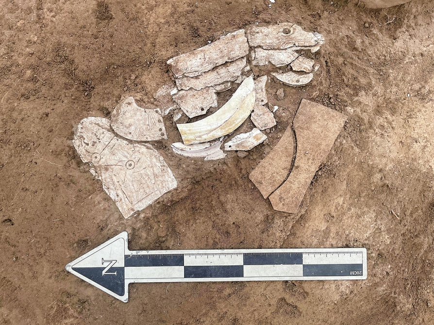 考古人员胡春柏介绍,此蚌饰出土自彩陶坡遗址一座房址的西南角,此蚌饰看上去似龙,由头部、身部、尾部等几部分组成,整体分布范围长20厘米左右,短吻,口部张开,头部朝向彩陶坡坡顶的方向。突起的圆额下面有表现眼部的圆形镂孔,镂孔外围有一周凹槽,推测眼部可能原来有镶嵌。尾翼朝向彩陶坡坡底的方向,略上扬,与身体连接的一端可见4个圆形钻孔,可能用以穿系,借此与身体部位相连接。尾部刻划有菱格纹来表现鳞片。