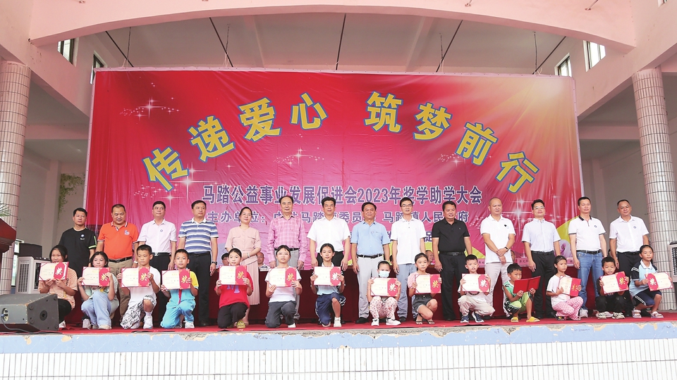 茂名晚报讯 记者陈琴 通讯员杨进福为在全社会营造尊师重教的良好氛围,促进教育事业再上新台阶,8月25日上午,由中共马踏镇委员会、马踏镇人民政府、马踏公益事业发展促进会共同举办的“传递爱心筑梦前行”2023年奖学助学大会在马踏镇人民公园举行。会上奖励优秀学生73人,奖金10.75万元,资助困难学生67人,助学金20.8万元。