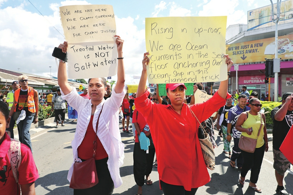 8 月 25日,民众在斐济首都苏瓦游行抗议日本核污染水排海。 新华社发(桑钦龙摄钦龙摄))