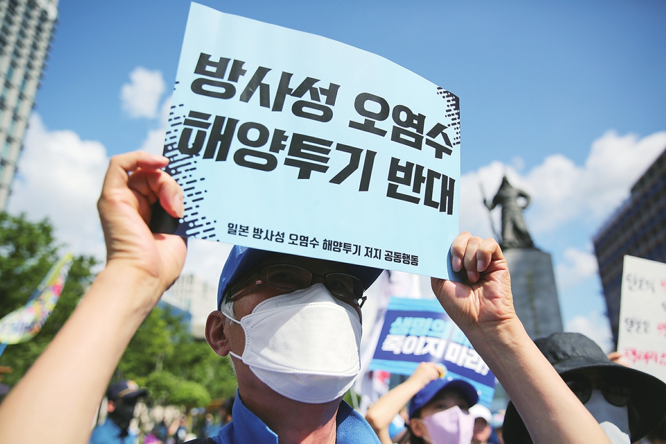 8月25日,在韩国首尔光化门广场,人们手持标语抗议日本核污染水排海。 新华社记者王益亮摄