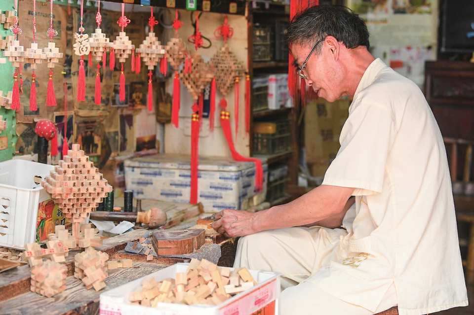 ▲非遗传承人在诸葛村制作孔明锁(2023年8月1日摄)。