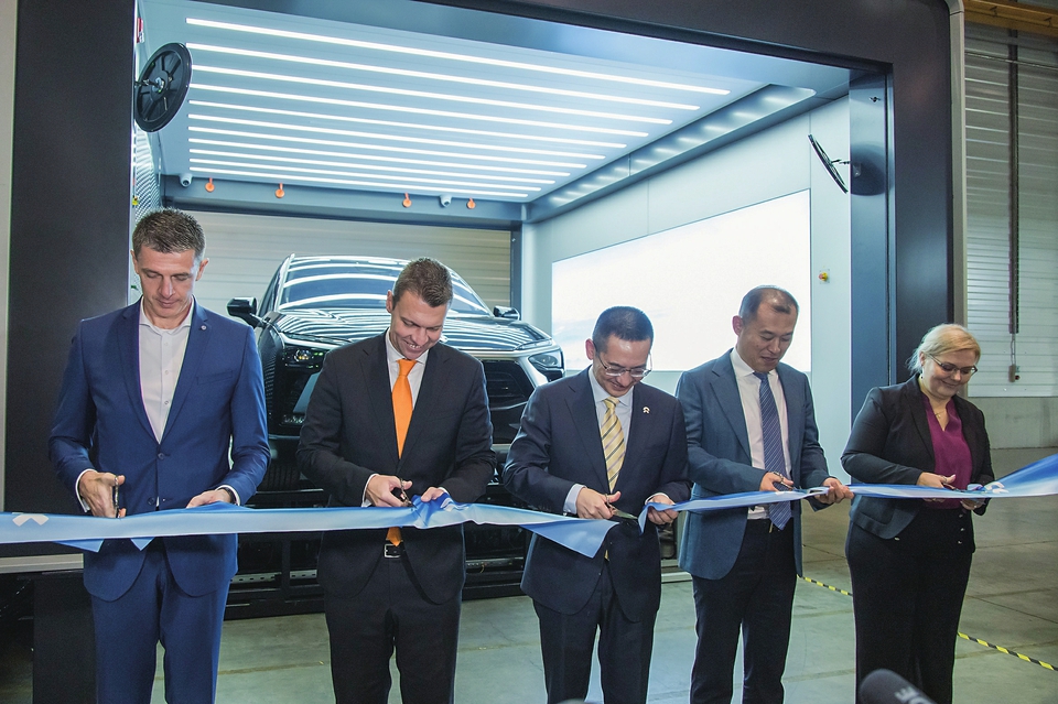 2022年9月,在匈牙利比奥托尔巴吉,蔚来能源欧洲工厂首座换电站正式下线,嘉宾们在换电站下线仪式上剪彩。 新华社发(弗尔季·奥蒂洛摄)