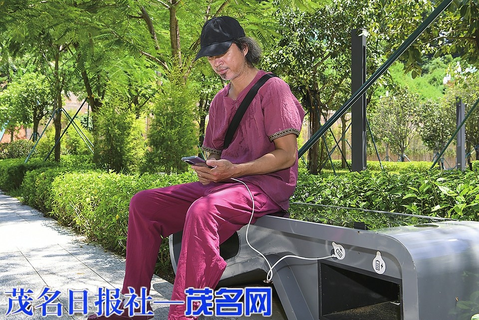 市民体验智能座椅为手机充电。 茂名日报社全媒体记者 甘杨松摄