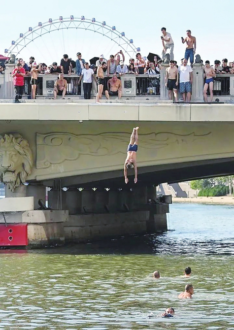 8月29日,天津海河上,一位“大爷”从狮子林桥,跳入水中。新华社记者孙凡越摄