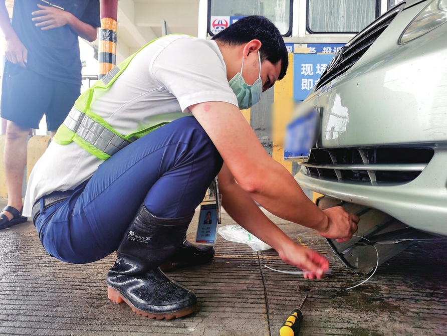 9月10日上午,一台银色小车在大雨滂沱中途经包茂高速茂名东站时发出异响。经工作人员黄文志提醒后,司机发现是车辆底盘脱落着地拖行发出的声响,但由于工具和经验欠缺且天气不佳,正是一筹莫展。熟悉维修的王文志当即从站场工具箱中取出铁丝,麻利地将掉落部件绑扎起来,反复确认车辆可暂时安全行驶后,热心指引司机前往附近修理点进一步检修。