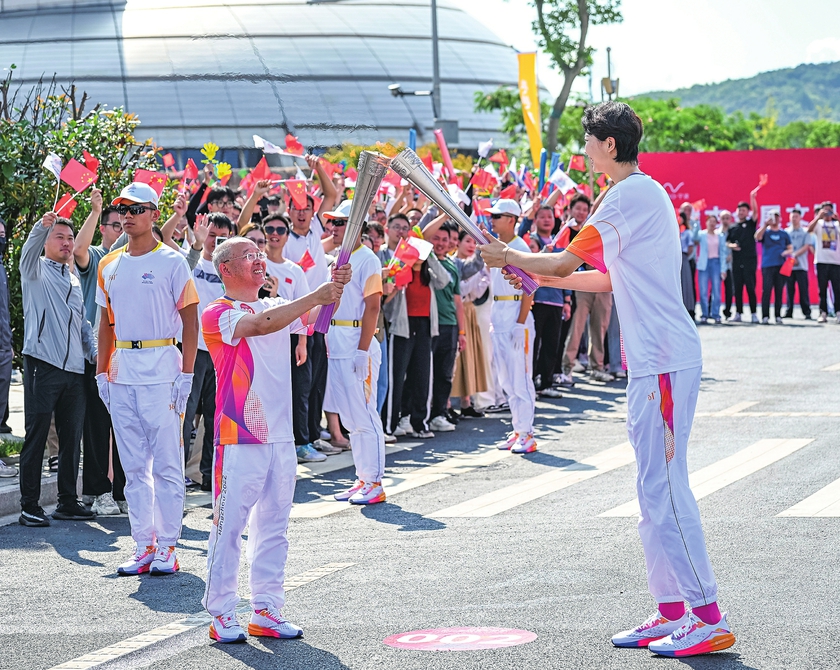 9 月 12日,火炬手袁心玥(右)和钱海军在火炬传递中。当日,杭州亚运会火炬在浙江省宁波传递。 新华社记者孙非摄