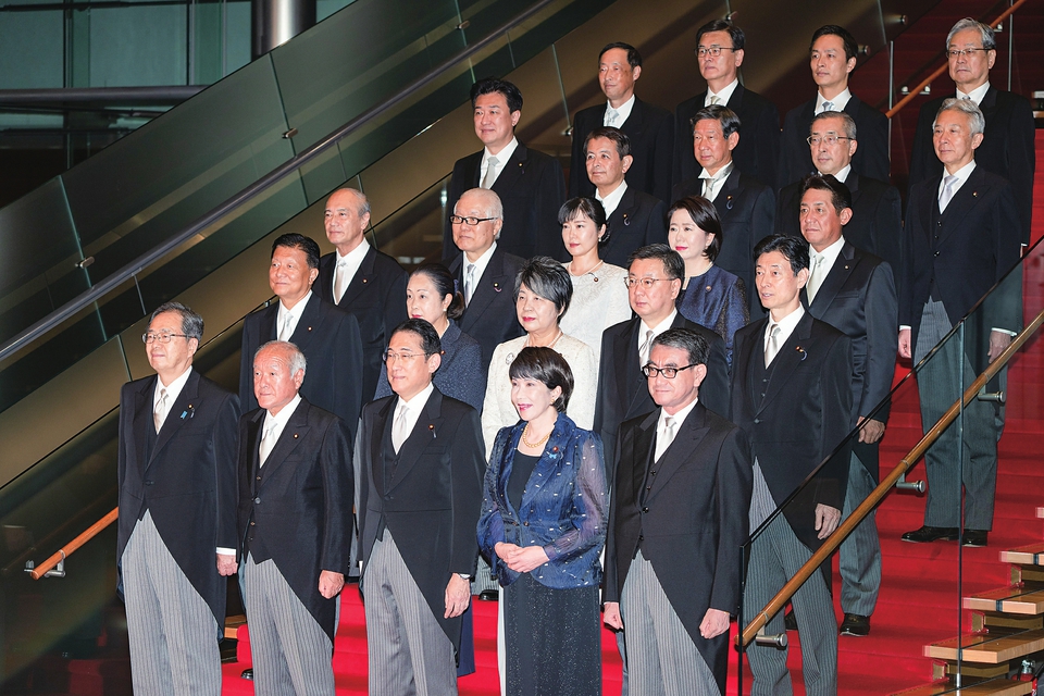 9月13日,日本首相岸田文雄(前排中)在东京的首相官邸率阁僚合影。 新华社记者张笑宇摄