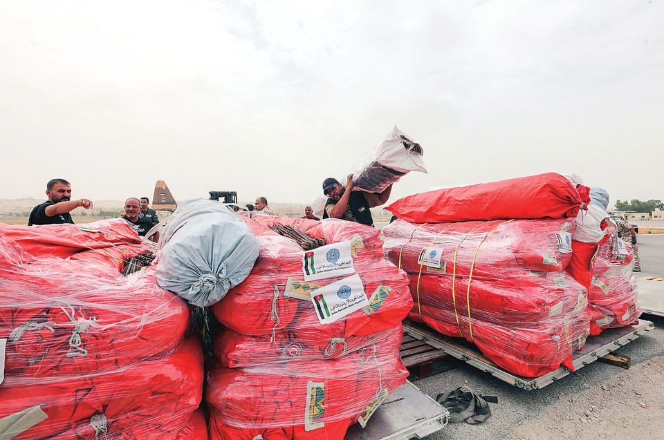 9 月 13日,工作人员在约旦安曼一军用机场搬运发往利比亚的援助物资。 新华社发(穆罕默德·阿布·古什摄)