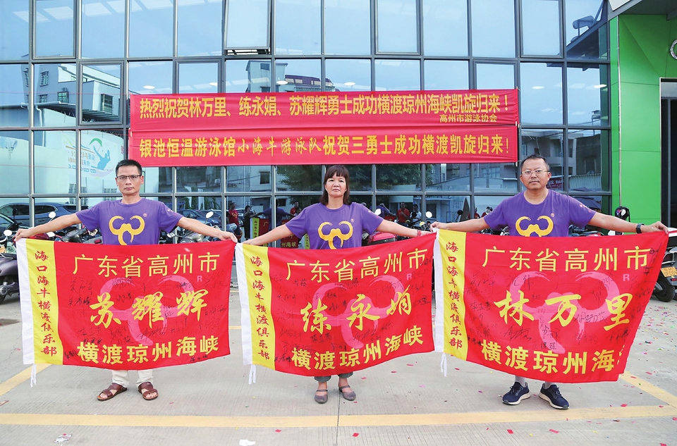 苏耀辉、练永娟、林万里横渡琼州海峡凯旋。茂名日报社全媒体记者李颜东摄