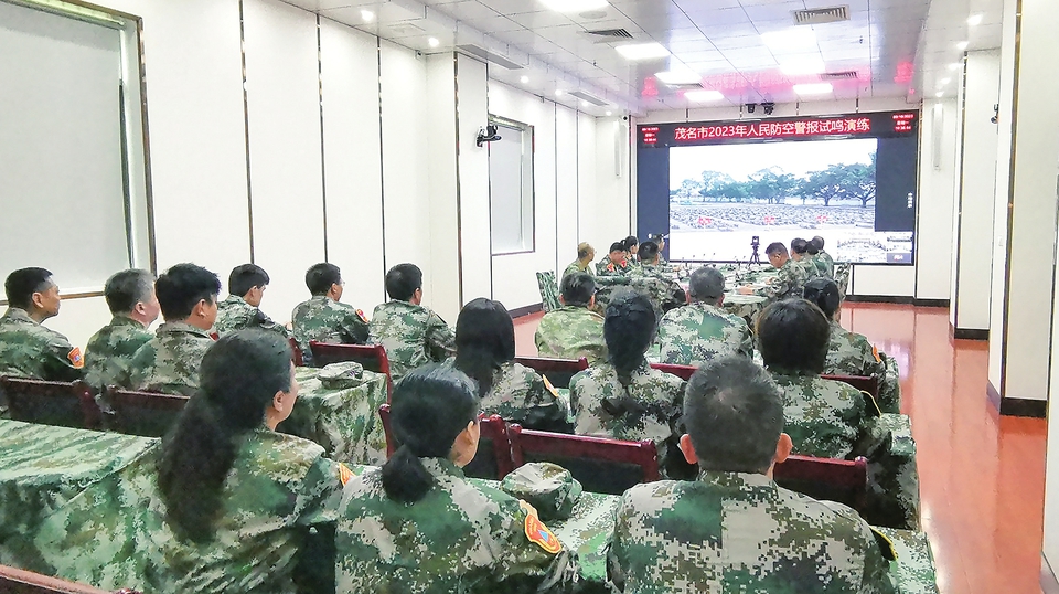 “茂名市2023年防空警报试鸣演练现在开始!”上午10时30分,随着韩海滨的一声令下,全市人防警报齐鸣,按照“预先警报”信号、“空袭警报”信号、“解除警报”信号的顺序依次发放,鸣响持续10分钟。在人防应急指挥中心试鸣演练活动现场,解说员同步解说三种警报信号的相关知识和防空袭城市人口疏散基本常识。