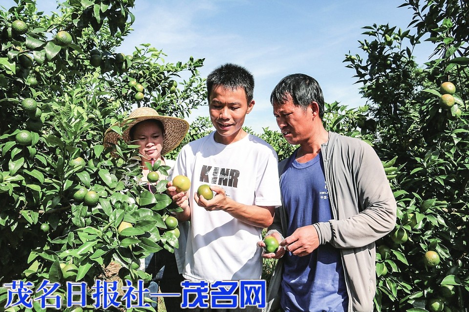 信宜“新农人”甘龙生(中)在指导果农进行沃柑种植管理。 茂名晚报通讯员王庆珍摄