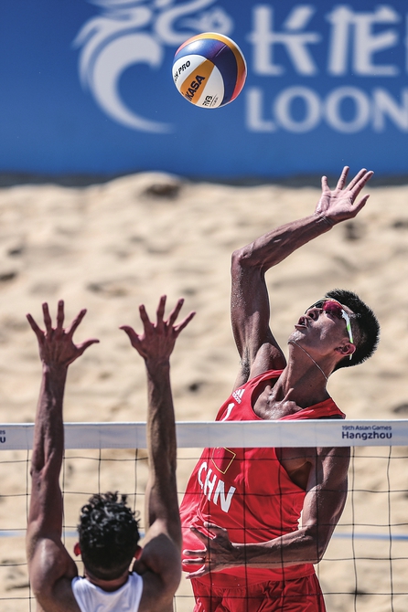 9月19日,中国选手王延伟(右)在浙江宁波进行的杭州亚运会沙滩排球男子小组赛E组比赛中扣球。最终,中国组合王延伟/李杰以2比0战胜巴勒斯坦组合阿卜杜拉·阿尔坎/易卜拉欣·卡西亚。新华社记者陈斌摄