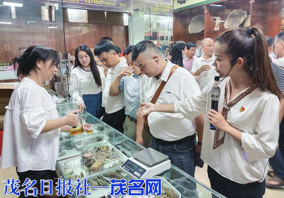 为他们作讲解的是电白电视台驻观珠镇沙垌村第一书记钟影虹。“大家对沉香的求知兴趣真是非常高,所有人都兴致勃勃。”她说,到这里了解沉香的人越来越多,以前以采购商、批发商为主,现在游客也明显多起来,忙起来的时候她都顾不上喝水。“在我们村,每一个店的人员都可以是导游,很多店主是沉香三代、四代,对沉香和沙垌村都非常熟悉,有时候我忙不过来,也会请他们做志愿者为游客作讲解。