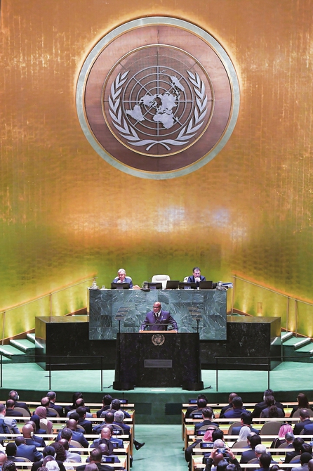 9月19日,在位于纽约的联合国总部,第7878届联大主席弗朗西斯在联合国大会一般性届联大主席弗朗西斯在联合国大会一般性辩论开幕式上讲话。新华社记者李睿摄