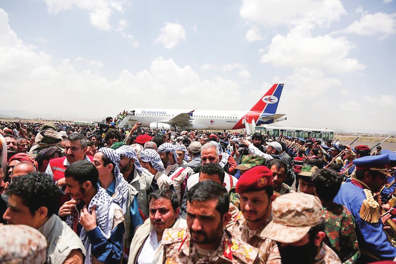 4月14日,在也门萨那机场,人们迎接获释的胡塞武装成员战俘。 新华社发(穆罕默德·穆罕默德摄)