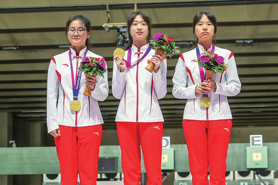 新华社杭州9月24日电(记者林德韧、王春燕、郑梦雨)杭州亚运会射击比赛24日开赛,由三名“00后”选手黄雨婷、韩佳予和王芝琳组成的中国队发挥出色,拿到女子10米气步枪团体冠军,17岁的黄雨婷拿到女子10米气步枪个人金牌。
