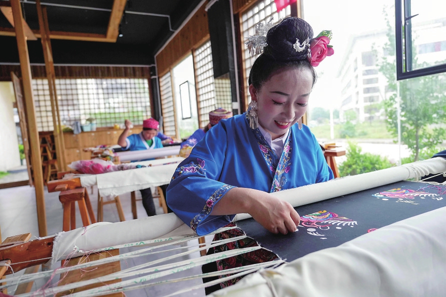 8月25日,绣娘在贵州省黔东南苗族侗族自治州施秉县一家非遗企业苗绣生产车间赶制订单。新华社发(王炳真摄)