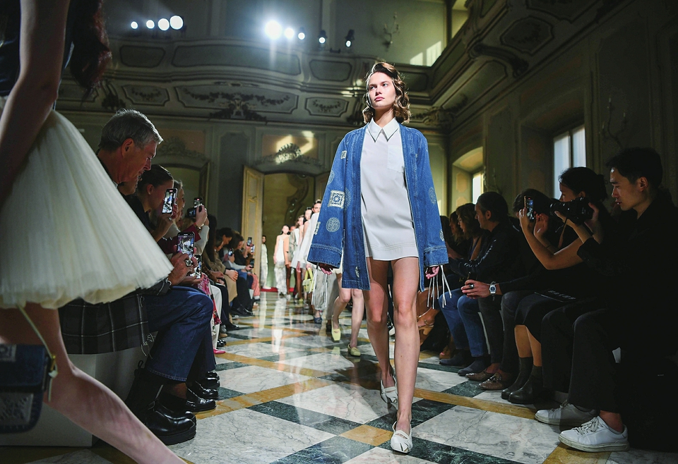 9月24日,模特在意大利米兰时装周上展示含有贵州苗绣元素的设计时装。新华社记者金马梦妮摄