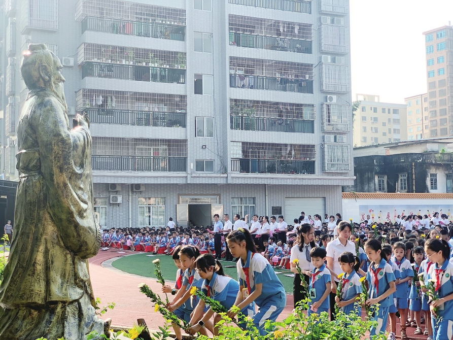 学生代表在孔子像前献花。茂名日报社全媒体记者陈俊明摄
