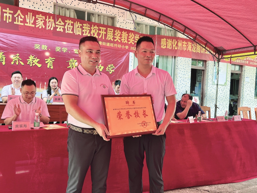 当天的活动中,旺竹圩小学校长向化州市企业家协会常务执行会长兼秘书长、化州市新晟汽车有限公司董事长陈裕新颁发荣誉校长聘书。陈裕新表示,被授予荣誉校长感到非常荣幸,向一直关心母校发展、长期奉献在教育战线的老师们致以崇高的敬意,并向一起奉献爱心的企业家们表示真诚的谢意!在化州市企业家协会会长张锦达的带领下,39 名爱心企业家分别捐赠资金 100 到2000元不等,开展奖教奖学活动,奖励优秀教师 5 名,优秀学生一等奖二等奖三等奖共 15 名优秀学生,奖励金额共计4500元。陈裕新还向石湾旺竹圩小学捐赠会议室桌椅合计金额13960元,大力支持学校的教育教学工作。