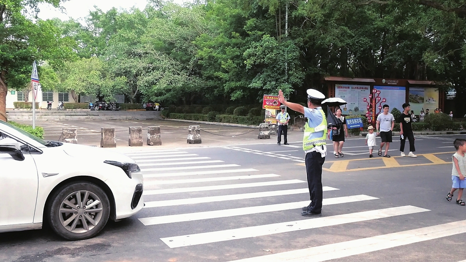 茂名交警在森林公园景区外指挥车辆有序通行。茂名晚报记者黄宇彬摄
