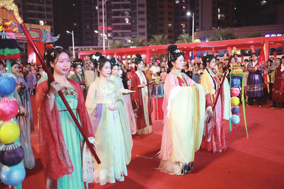 茂名晚报讯记者李君平 花好月圆,锦绣中华。9月29日晚,化州首届中秋拜月典礼·凤舞九天灯光秀在化州万达广场圆满落幕。当晚,通过汉服队伍巡游、拜月典礼和“飞天凤凰”等精彩节目,向市民游客呈现了一场古今交融、古典雅致的视觉与文化盛宴。