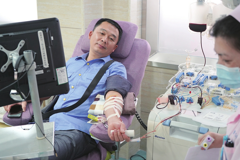 ▲冼铸光正在献血。