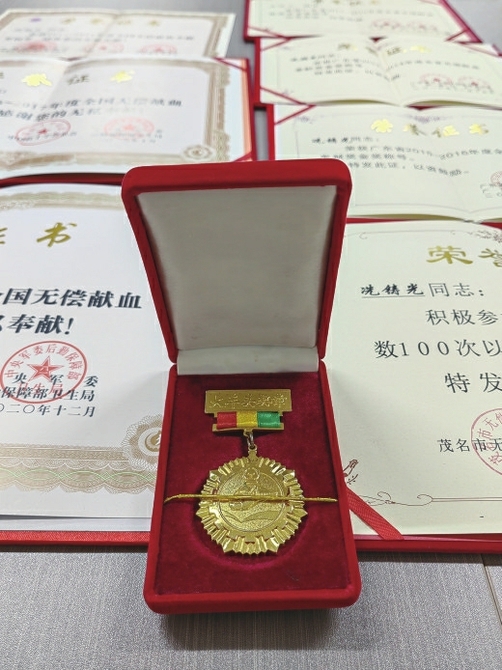 ▲冼铸光多次献血所获得的荣誉。
