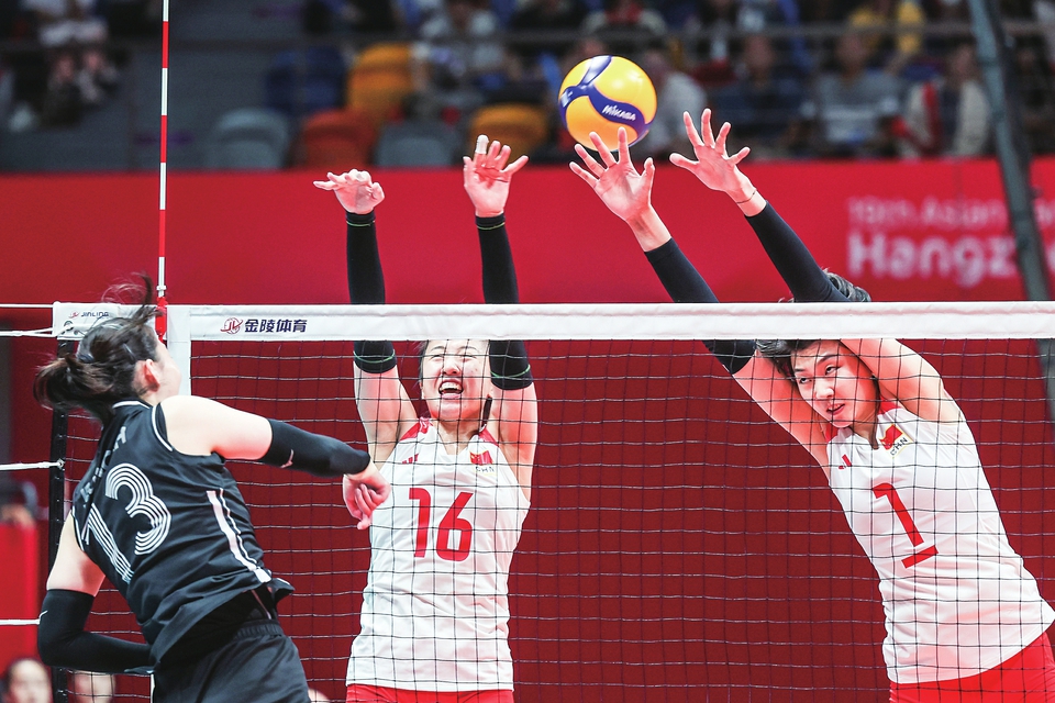 10月4日,中国队球员丁霞(中)、袁心玥(右)在比赛中拦网。当日,在杭州亚运会排球项目女子E组排位赛中,中国队以3比0战胜韩国队。新华社记者朱峥摄