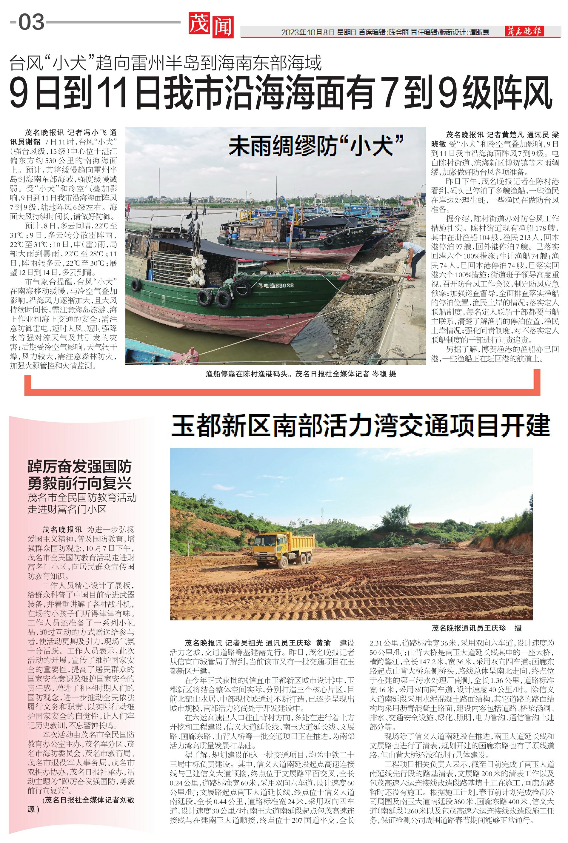 茂名晚报讯记者黄楚凡通讯员梁晓敏受“小犬”和冷空气叠加影响,9日到11日我市沿海海面阵风7到9级。电白陈村街道、滨海新区博贺镇等未雨绸缪,加紧做好防台风各项准备。