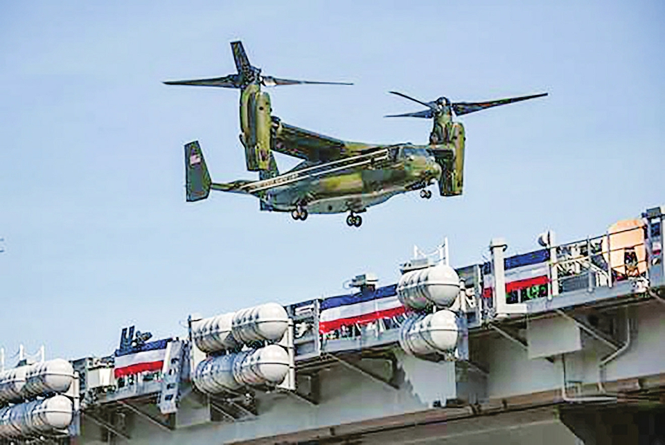 2017年7月22日,在美国弗吉尼亚州诺福克海军基地,一架海军陆战队MV-22B鱼鹰旋翼机降落在“福特”号航母上。新华社记者殷博古摄