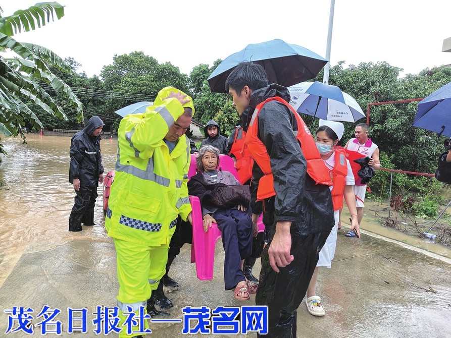 10月20日上午,茂南公安分局官渡派出所接到住在官山一路某大院的群众求助。当时雨势较大,该所2辆出警车辆均被水浸坏无法使用,值班警力只能冒雨步行出警。辖区部分路段的水位已经没过腰际,民辅警们已经顾不上全身湿透,将可能受到汛情影响的10余名群众全部转移出来。其中有2名80多岁老人家因行动不便,民辅警合力先后将老人抬出危险区域,转移到安全的地方。