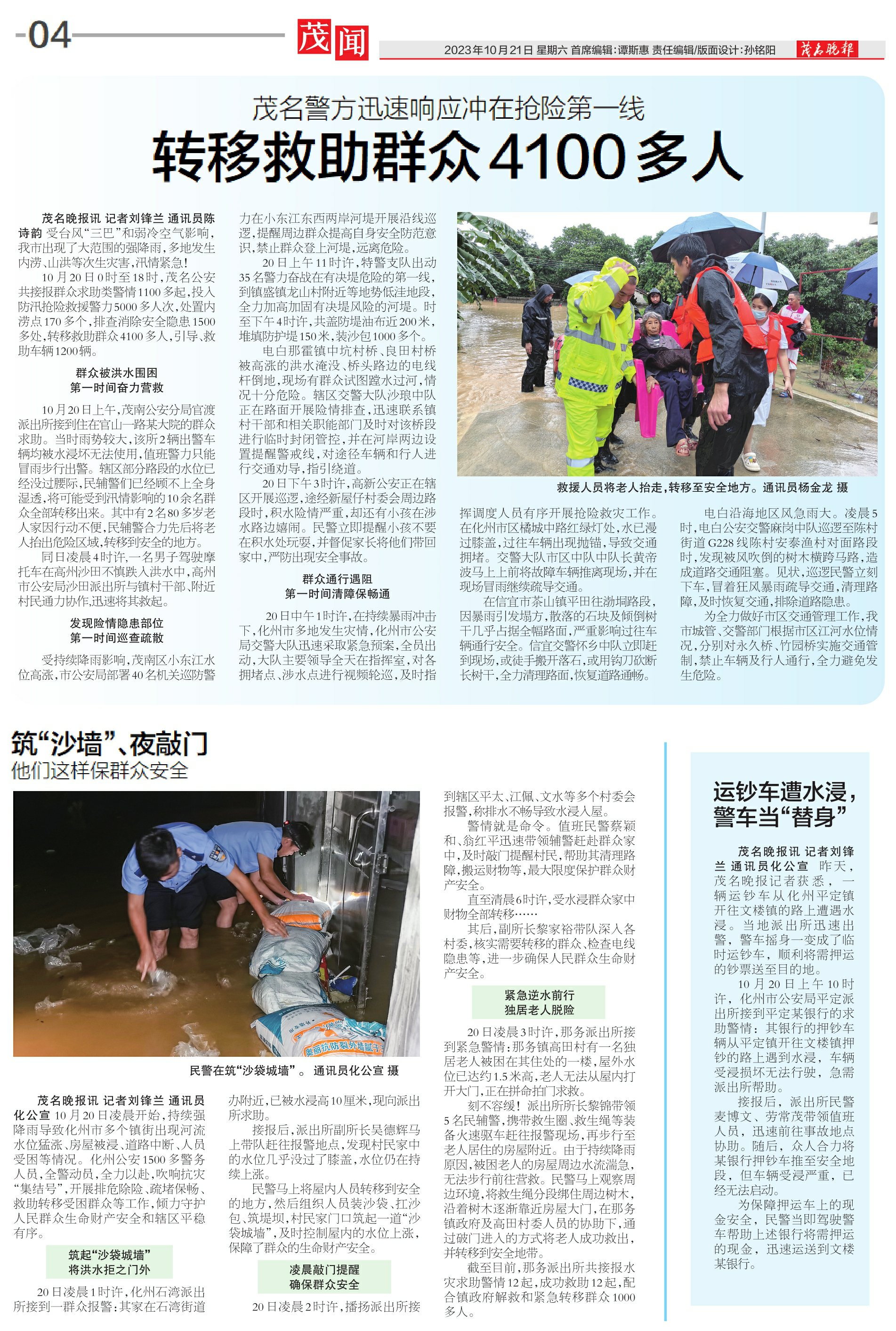 10月20日0时至18时,茂名公安共接报群众求助类警情1100多起,投入防汛抢险救援警力5000多人次,处置内涝点170多个,排查消除安全隐患1500多处,转移救助群众4100多人,引导、救助车辆1200辆。