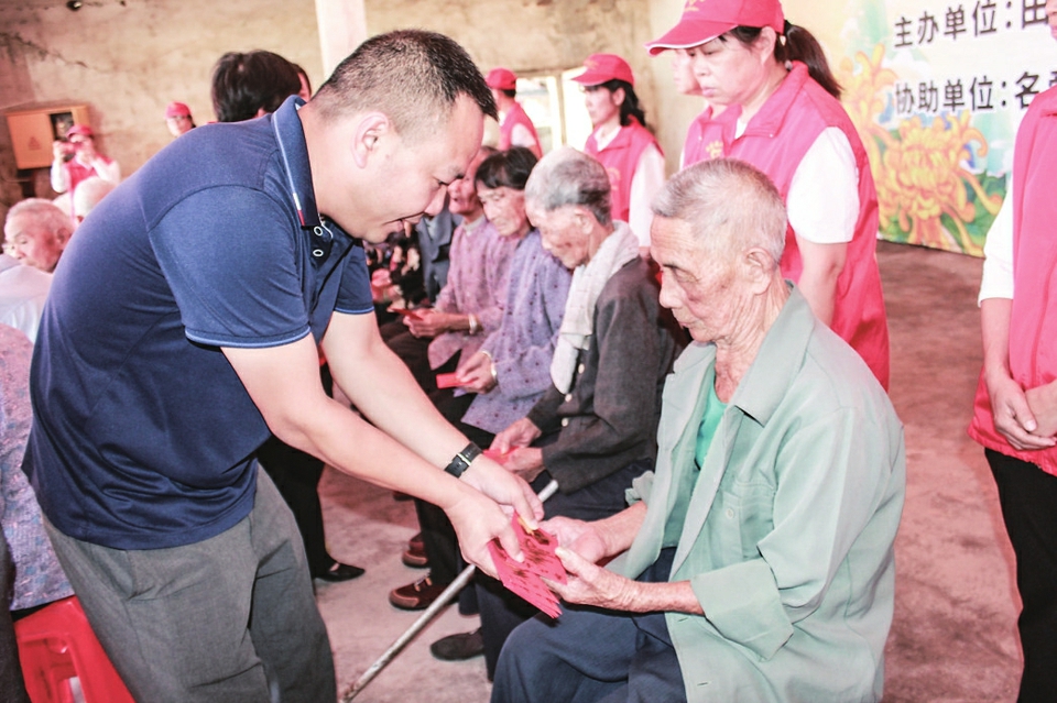中午12时许,500位老人被邀入席共享重阳午餐。而在开餐前,村中20多位90岁以上的老人,在志愿者的细心搀扶下,来到广场舞台上,喜领由镇村干部及乡贤派发的节日大红包。99岁高龄的潭婆婆和陈婆婆开心不已,逢人就说:现今这个社会真好,老人有吃有喝还有红包领。我们要好好活着,多享受这么好的生活。