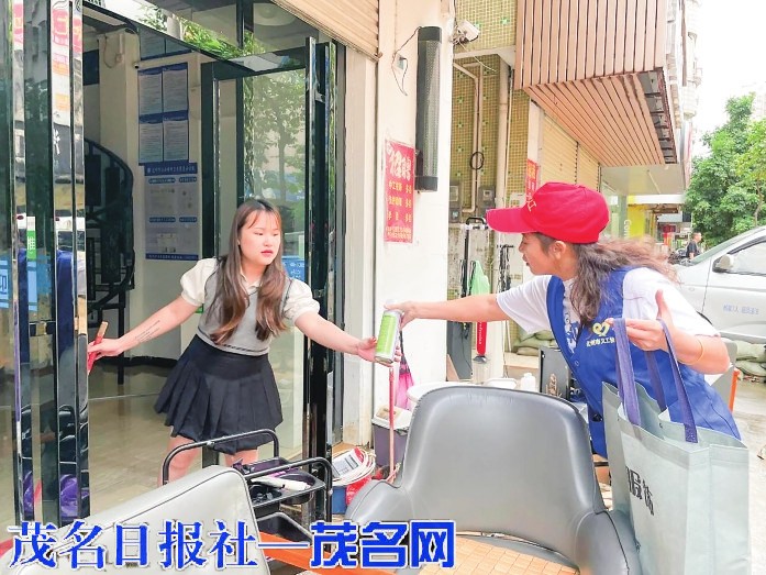 义工免费派发消毒液。茂名晚报记者吴 祖 光摄
