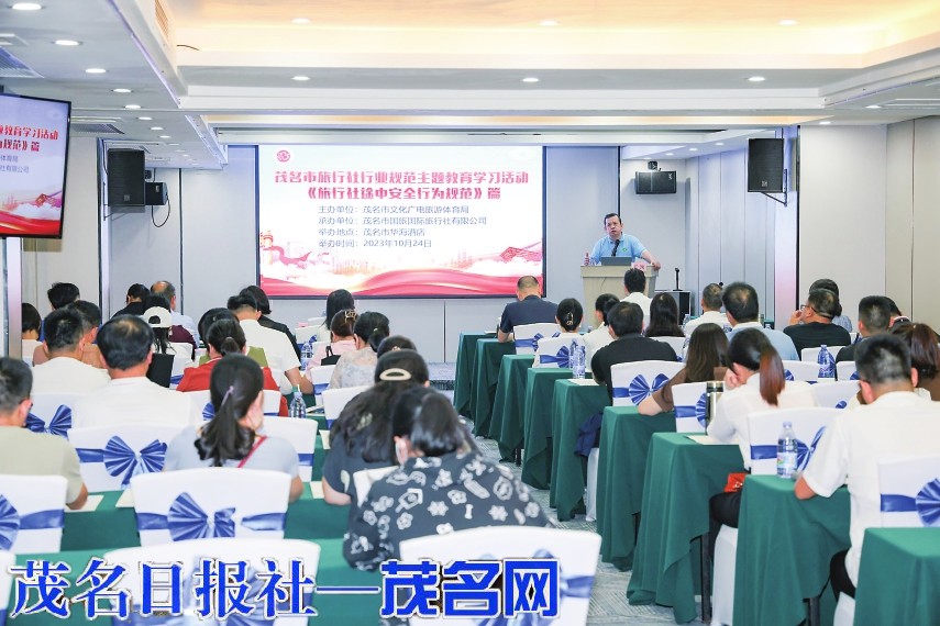 茂名晚报讯 记者张丁文 实习生甘晓露 10月24日,由茂名市文化广电旅游体育局主办,茂名市国旅国际旅行社有限公司承办的茂名市旅行社行业规范主题教育学习活动《旅行社途中安全行为规范》篇在华海酒店举行,近60名旅行社行业从业人员参加学习。