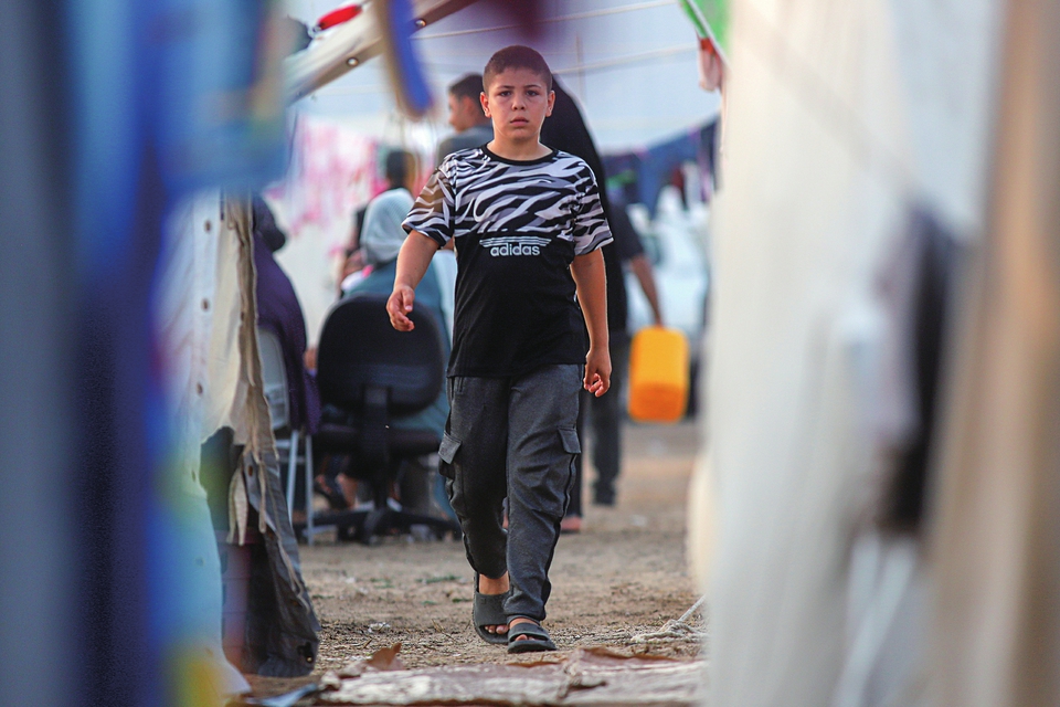 10月25日,儿童走在加沙地带南部一处收容流离失所巴勒斯坦人的临时营地内。 新华社发(里 泽克·阿卜杜勒贾瓦德摄)