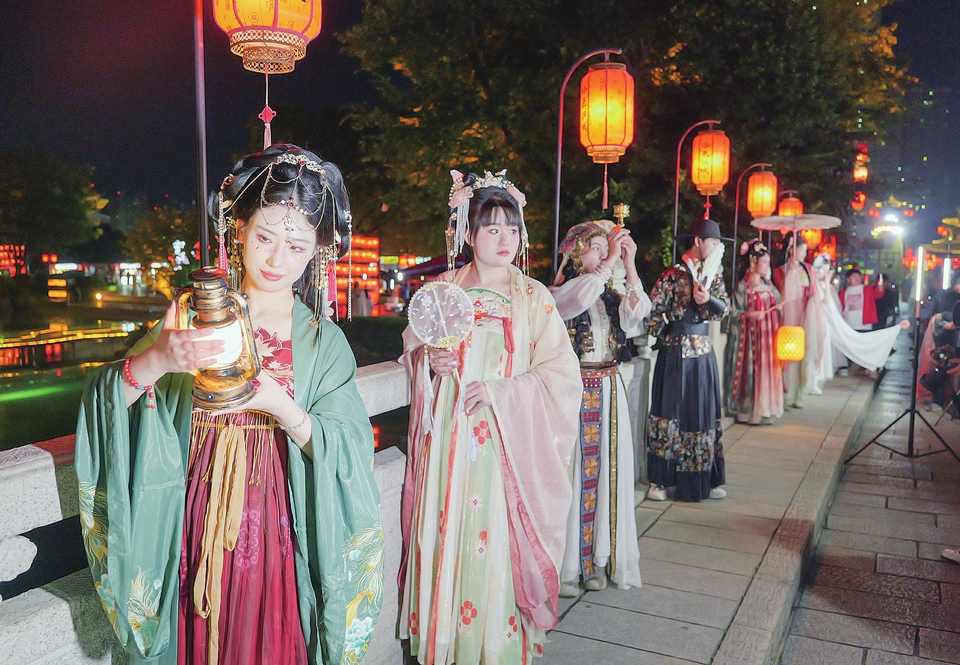新华社电 夜幕降临,华灯初上,洛邑古城涌入上千名游客。裙裾飘飘、团扇遮面、笑靥嫣然,身着汉服的古装佳人或倚窗凝思,或凭栏望月,或驻足观灯,置身其中,仿佛穿越时空,梦回大唐。