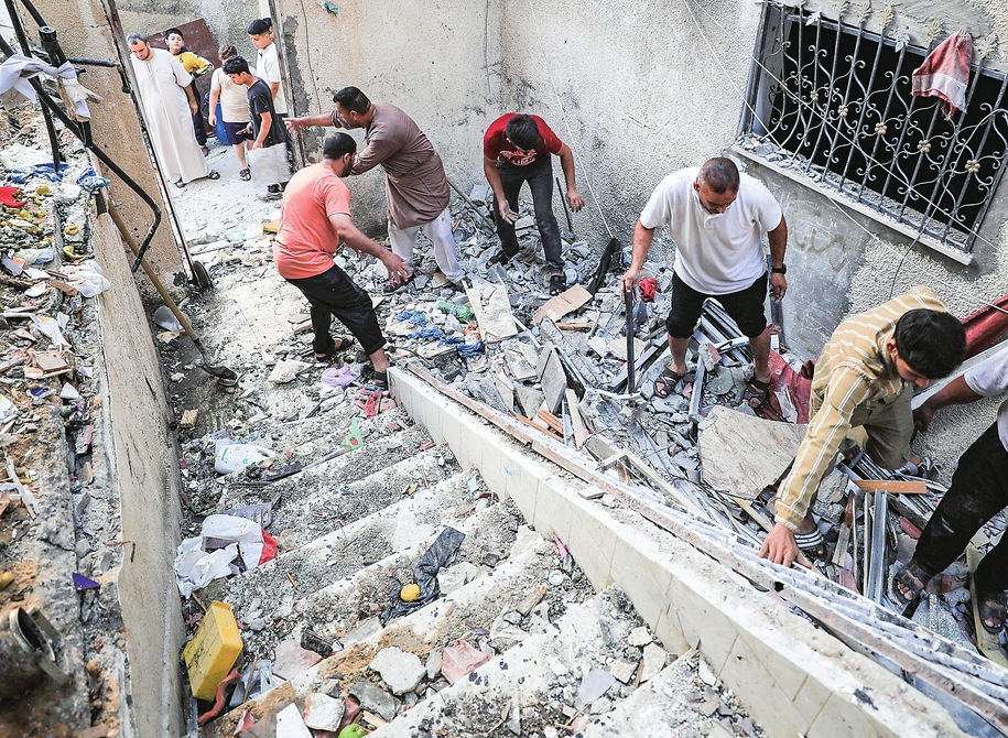 11月3日,在加沙地带南部城市汗尤尼斯,人们清理遭以色列袭击后的建筑废墟。新华社发(亚西尔·库迪摄)