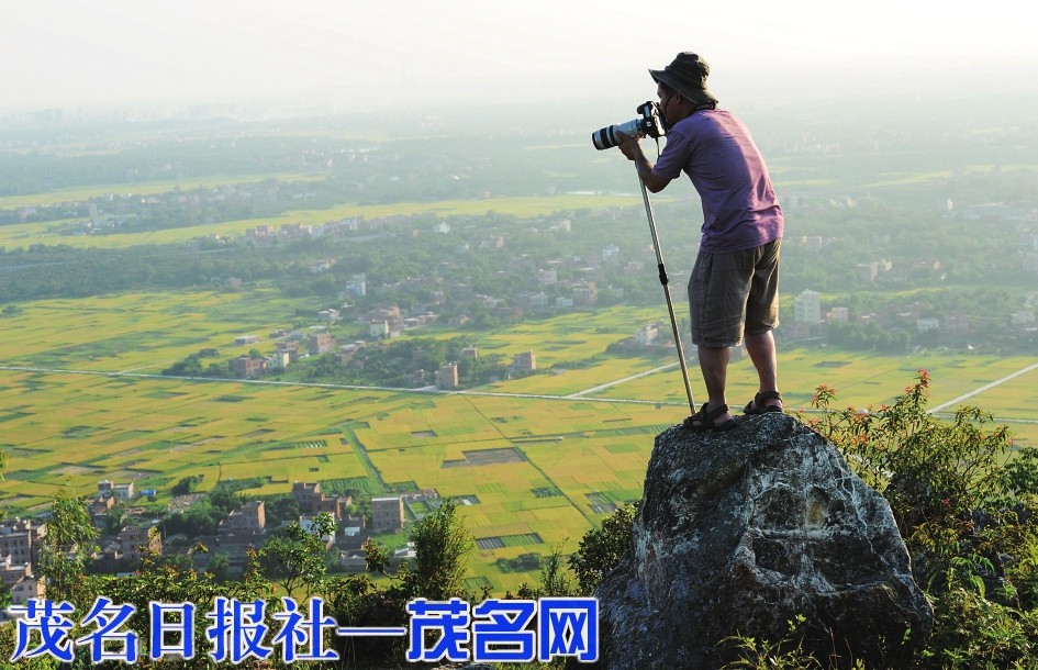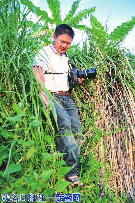 采访拍摄丰收的田园。茂名日报社全媒体记者黄信涛摄