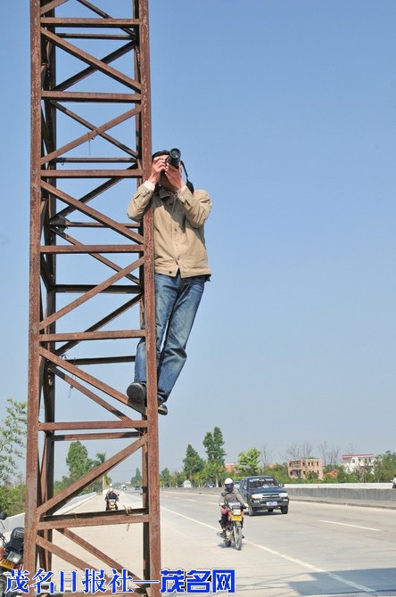 爬上铁架上拍摄。茂名日报社全媒体记者黄信涛摄