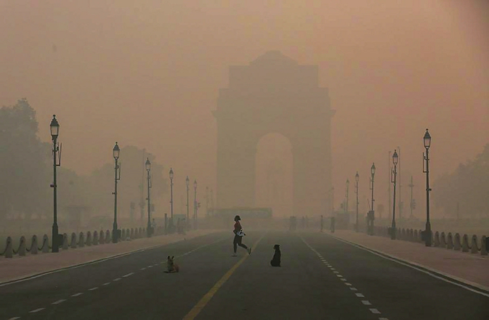 2022年11月3日,在印度新德里,一名女子在雾霾天气中出行。 新华社发(贾韦德·达尔摄)