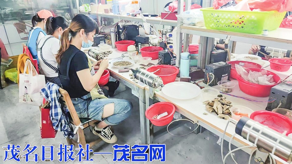 当地一家珠链厂工人在加工沉香珠链。茂名晚报记者张永坚摄