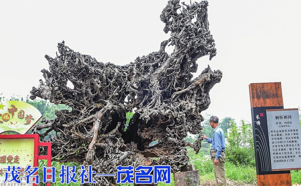 信宜市东镇街道长塘社区长塘村,在推动乡村振兴建设中,村道已黑底化成了“碧道”,村中小公园、“四小园”的建设让这个自然村面貌焕然一新。近日,记者在探访该村时赫然发现两个用荔枝树枝干与树根的雕刻作品独特,突显了村民的家国情怀。