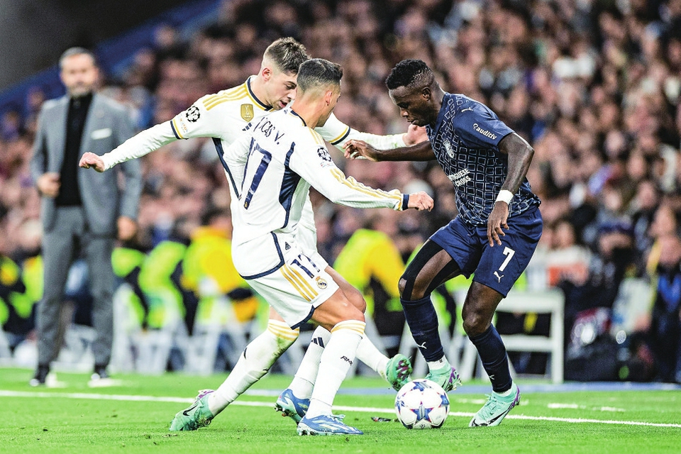 11月8日,皇家马德里队球员巴斯克斯(中)、巴尔韦德(左)与布拉加队球员布鲁马在比赛中拼抢。新华社发
