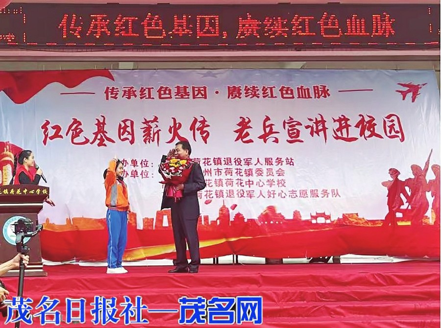茂名晚报讯记者黄楚凡通讯员黄倾峰邹健“少年强则国强,少年智则国智……”11月13日上午,凛冽的寒风中,高州市荷花镇退役军人好心志愿服务队宣讲团走进荷花中心学校,开展“红色基因薪火传老兵宣讲进校园”主题的宣讲活动,教育引导学生们要传承红色基因、厚植爱国情怀。