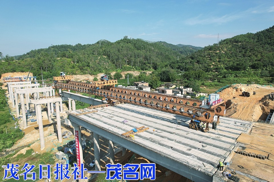 茂名晚报记者了解到,此次架设的预制T梁位于该项目部二工区金坡村大桥,大桥全长约270米,是该工区9座桥中第一座进入上部结构施工的桥梁,也是阳信高速公路茂名段首个进行跨公路架梁的桥梁。