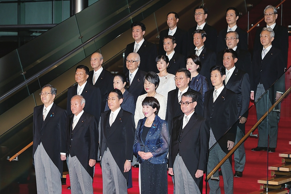 9月13日,日本首相岸田文雄(前排中)在东京的首相官邸率阁僚合影。新华社记者张笑宇摄