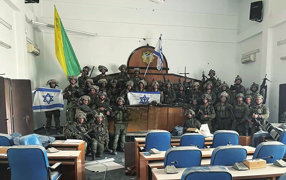 这张以色列媒体11月13日刊发的照片显示,以色列国防军士兵在加沙城巴勒斯坦伊斯兰抵抗运动(哈马斯)立法委员会大楼里举着以色列国旗。 新华社发