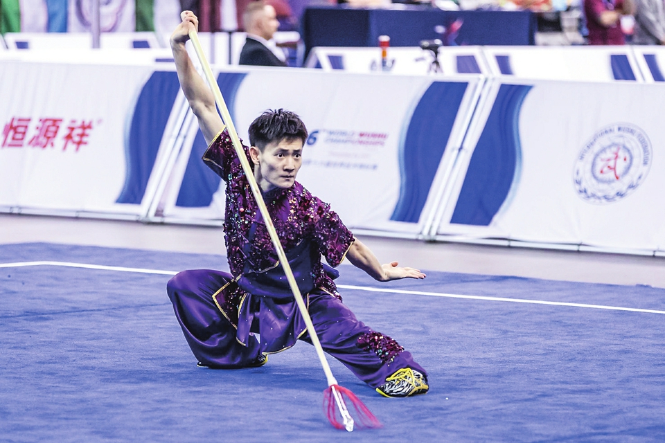 11月19日,中国选手张清淳在男子枪术比赛中。最终,他获得男子枪术冠军。新华社发(田丹摄)